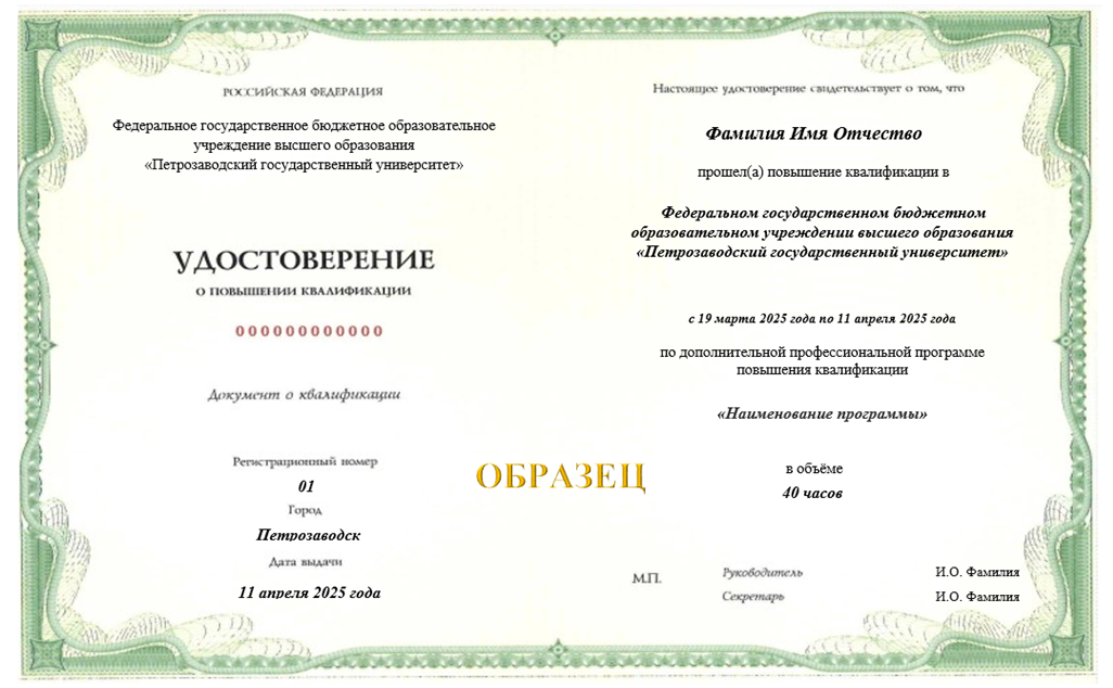 Удостоверение о повышении квалификации ФГБОУ ВО “Петрозаводский государственный университет” Нажмите на изображение, чтобы увеличить документ |